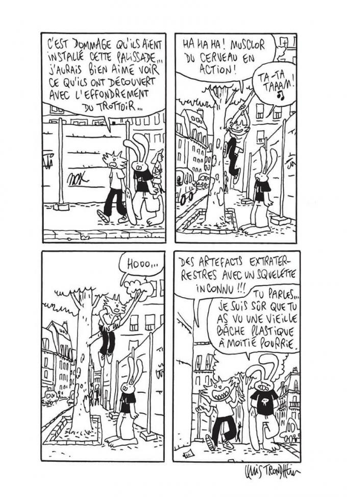 Un trou béant est apparu sur le trottoir. Ce trou va entraîner Lapinot et Richard dans une grande mini-aventure en deux parties : Sous le trottoir, puis Ultrasecret. Nos deux amis vont être embarqués malgré eux dans une histoire d’espionnage, au grand dam de ceux qui vont croiser leur route. Lewis Trondheim présente le récit sous forme de strips avec chute à chaque page. C’est dramatiquement drôle. L’auteur a créé le concept au moment du premier confinement en postant quotidiennement sur Twitter un strip en trois cases dont les lecteurs devaient deviner la chute pour en faire une quatrième. Ceux qui la devinaient gagnaient une carte postale de l’auteur. Lewis Trondheim est définitivement le plus grand agitateur d’idées.