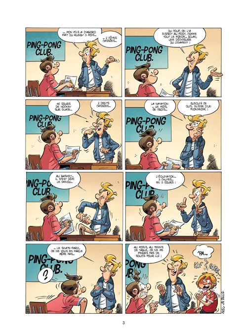Côté scénario : Axel, lui-même affilié FFTT avec son père depuis plus de 13 ans, connaît donc parfaitement l'univers des pongistes. Il peut ainsi largement s'en inspirer. Ceci d'autant plus qu'avec son père de dessinateur, qui sait s'il n'en a pas vécu personnellement quelques-unes ? Bonne chose !
