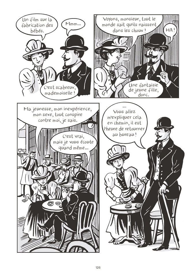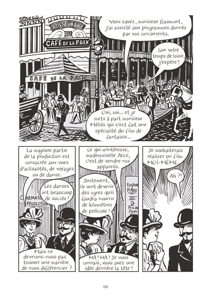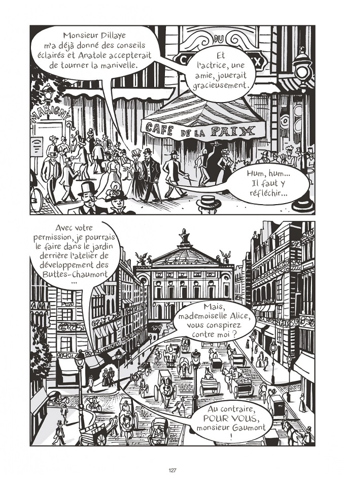 C’est toute cette vie foisonnante que José-Louis Bocquet nous scénarise avec brio, sans longueur, ni lassitude. Une impressionnante documentation, constituée notamment des mémoires d’Alice Guy elle-même, lui a servi de base à la réalisation de son scénario. Complicité parfaite avec sa dessinatrice de cœur, le séquençage en pages et en cases, de la naissance à la mort d’Alice Guy, est digne d’un biopic BD « oscarisable » !