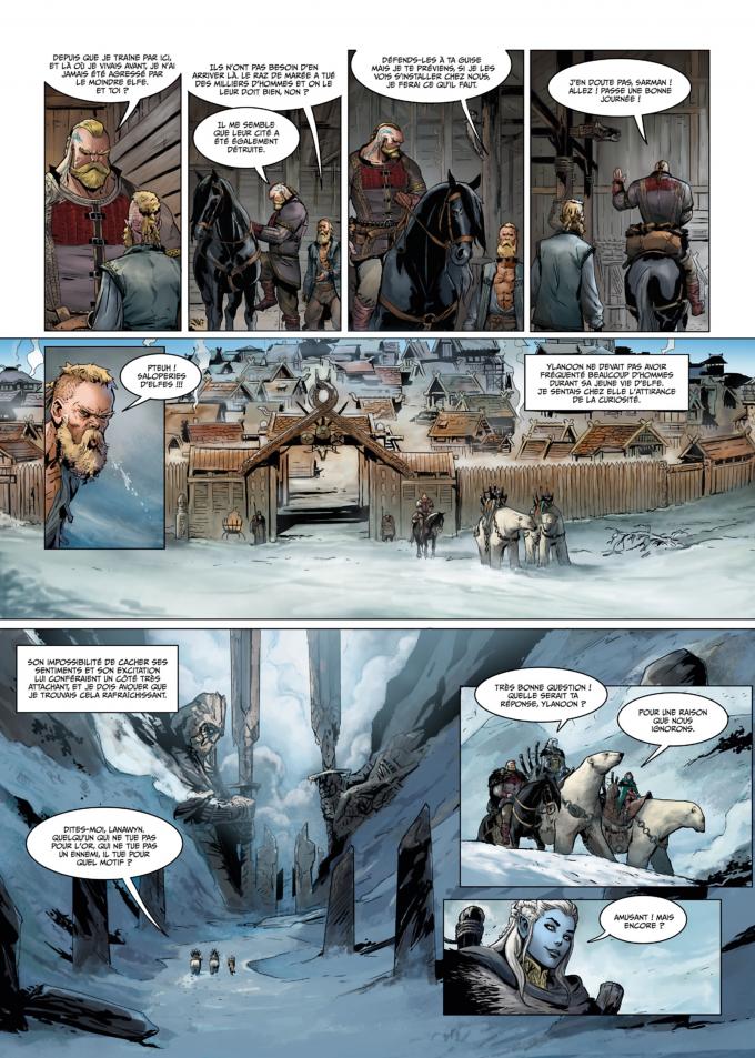 Au dessin, Kyko Duarte décapite elfes et hommes dans des paysages forestiers enneigés. Il y a un côté Royaumes du Nord de Philip Pullman avec d’impressionnants ours blancs servant de montures. Il y a un côté Rosinski avec le village des hommes où l’on pourrait voir Thorgal sortir d’une chaumière. L’elfe Lanawyn n’appartient qu’à lui. Duarte l’amène à un niveau de charisme et de beauté qui font tout le sel de ce genre de récits de fantasy.