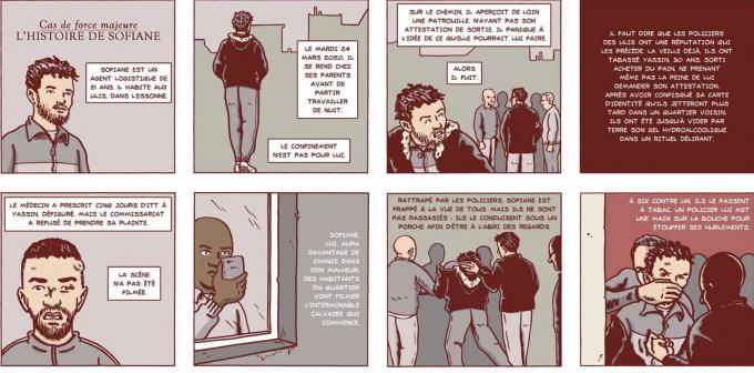 L’auteur alterne les séquences de violence ordinaire des policiers avec des cas connus qui ont été largement médiatisés. George Floyd étouffé sous le genou d’un flic raciste et sadique, Michel, le producteur de musique tabassé par un groupe de policiers dans son studio d’enregistrement à Bagneux dans les Hauts-de-Seine, ou encore Debora qui, parce qu’elle n’aura soi-disant pas mis correctement son masque, accouchera d’un enfant mort-né,… Voilà les dénonciateurs malgré eux d’actes inadmissibles. Il y a aussi des histoires improbables comme celle de cette libraire de Bagnolet, en quartier sensible, accusée de ne pas respecter les distanciations devant sa boutique pour que les clients viennent récupérer des livres en click and collect, ou encore celle d’une écolière de CM2, accusée d’apologie de terrorisme suite à un débat organisé par son maître d’école sur la liberté d’expression après l’assassinat de Samuel Paty.