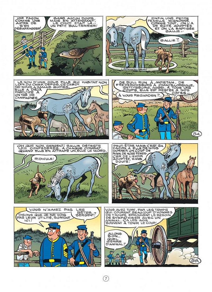 C’est un drôle de compagnon qui fait partie du régiment d’infanterie qui arrive au campement. Le Sergent Cornélius Chesterfield n’en croit pas ses yeux : une chienne. Un type en civil la leur a porté dans un panier puis s’en est allé. La petite bull-terrier a été baptisée Sallie, du nom d’une jolie fille qui habitait non loin du camp. Depuis, elle ne les a jamais quittés et a déjà participé à un tas de campagnes : Bull Run, Antietam, Fredericksburg, Chancellorsville, Gettysburg,… Elle déteste les confédérés. Chesterfield ne pouvait pas trouver meilleure complice pour s’approcher des lignes ennemies et ramener un prisonnier qui leur permettrait de savoir comment sont déployées leurs troupes.