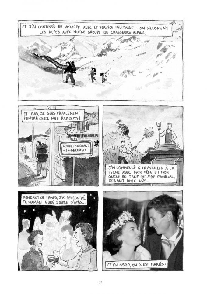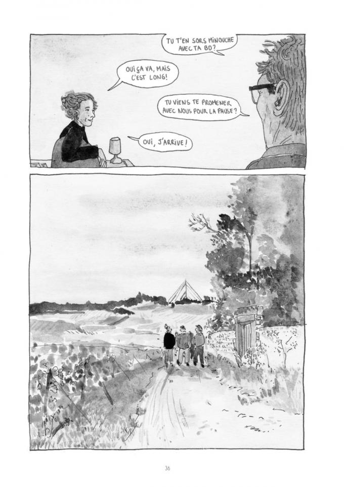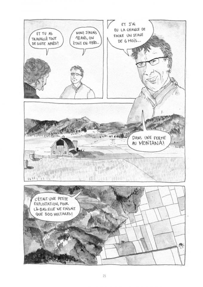Dans un graphisme en niveaux de gris à mi-chemin entre un style naïf et celui de Davodeau (qui entre parenthèses devrait adorer un livre comme celui-ci), Marine donne les clefs de toute l’évolution de l’agriculture depuis ses origines en général et depuis la Seconde guerre mondiale en particulier. On y vit le remembrement, l’agrandissement jusqu’au gigantisme des exploitations, les OGM, jusqu’à l’arrivée du bio, non pas présenté comme une dictature mais comme une nécessité.