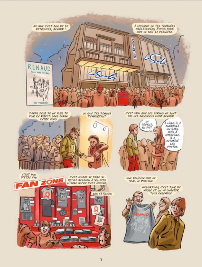 Par ailleurs, des « fan-zones » entrecoupant les différentes étapes de la vie de Renaud, offrent la possibilité à Alain Gaston Remy de dire combien, dans sa propre vie et celles des fans de son idole, ce dernier a marqué, façonné, influencé les générations qu’il a traversées.