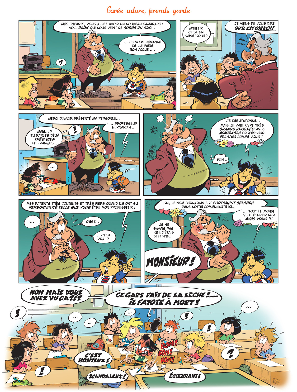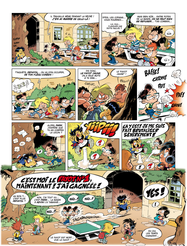 Je dirais familièrement que "nous nous sommes reniflés le derrière " durant pas mal d'années, nous avons testé différentes choses, un projet d'adaptation en BD de un gars une fille, puis de Brice de Nice, puis un projet " le petit président" se moquant de Sarkozy, avec un esprit strip et calvin et hobbes influence, quelques trucs d'humour noir, le tout toujours avorté par ma faute ( doute, procrastination , manque d'entrain, perte d'envie du dessin ), et que c'est sur une idée de Guy Delcourt en personne, celui de parler d'un petit fayot, (type Agnan dans le petit Nicolas) que nous avons pu"consommer" concrètement cette tardive union , haha .