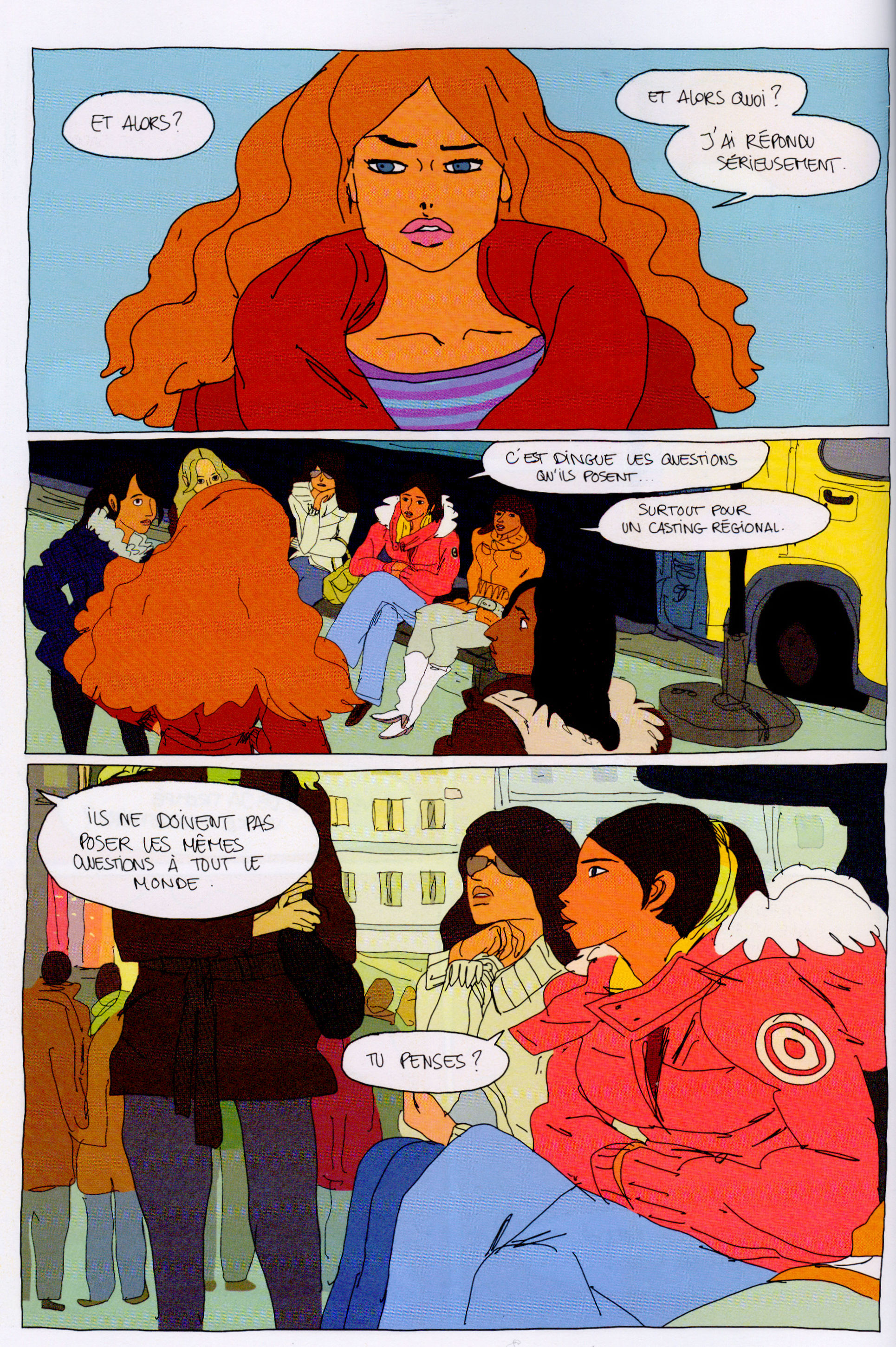 B: Non, je ne cherche pas forcément à surprendre. Je continue dans mon chemin logique des choses. Depuis que je fais des histoires, je raconte ce qui me touche. Jusqu'à présent, je m'intéressais aux relations entre un garçon et une fille et donc, ce sont les scénarios de mes histoires. Mais, je sais que les prochains projets ne sont pas du tout dans cette veine là. Il y aura des armées romaines dans une odyssée. Ou une danseuse étoile de ses six ans à ses quarante ans et la relation professeur/élève. Les choses évoluent. Amitié étroite, je l'ai fait, il y a un an. Le goût du chlore n'était même pas encore sorti. L'attente du lecteur ne me dérange pas du tout. J'essaye d'évoluer et de me concentrer sur l'instant présent.