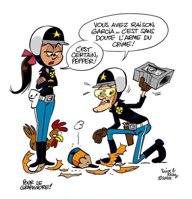 A l'occasion de la sortie de l'album «La poulette et le boulet» (Les Poulets du Kentucky) , le dessinateur Olivier Saive et le scénariste Hervé Richez, deux spécialistes en gallinacés, se sont soumis à la question. Ils ont confié avoir proposé leur projet chez Dupuis déguisés en flics et avoir gardé le même costume pour faire des dédicaces ! Dans ce premier tome, Garcia, fliquette de choc expérimentée, fait équipe avec Pepper, un pistonné maladroit qui accumule les bourdes. Le duo devra se coltiner les malfaiteurs les plus idiots et les serial killers les plus déjantés. Désopilant et hilarant pour ceux qui n'ont pas peur du sang...