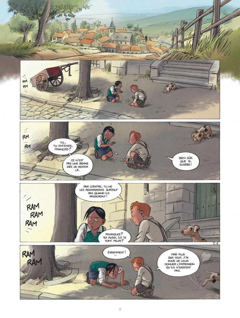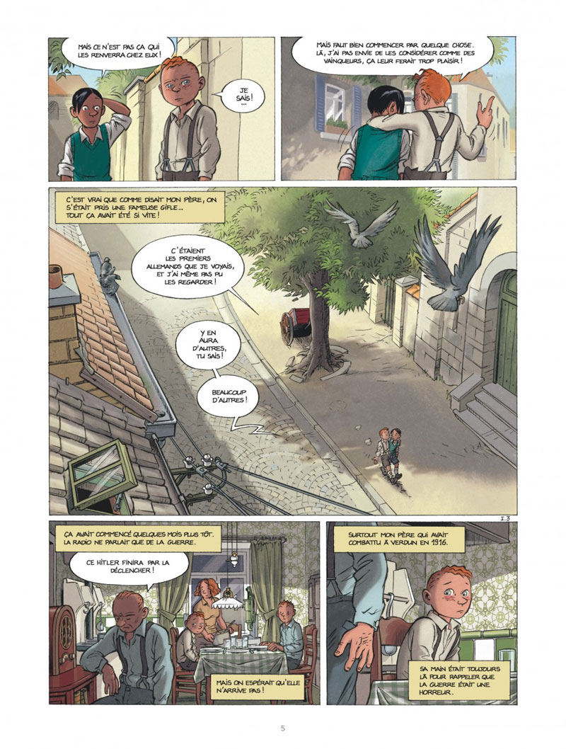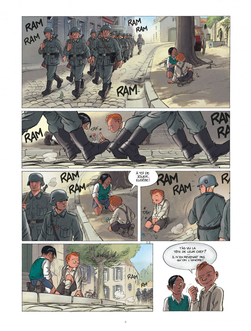 La scène d’introduction, quand les enfants jouent aux billes et qu’ils voient pour la première fois des Allemands entrer dans la ville, c’est inspiré du souvenir de mon papa. Ça ne s’est pas passé comme dans la BD mais ça l’a marqué de la même manière. Cette histoire est la somme de plein d’influences indirectes.