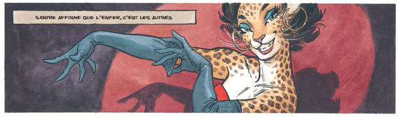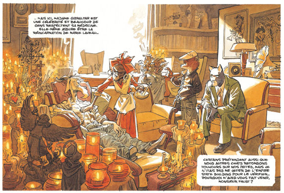 Canales : C’est vrai. C’est un peu un exemple de ce que je dis sur la biographie de Blacksad. Il y a des choses qui prennent forme au fur et à mesure que l’on développe la série. Le truc racial de Blacksad c’est un bon exemple. On n’a jamais pensé à ça pendant le premier tome mais dans le deuxième tome il est devenu métis. Il a prit conscience en même temps que nous qu’il était Noir avec une touche de blanc.