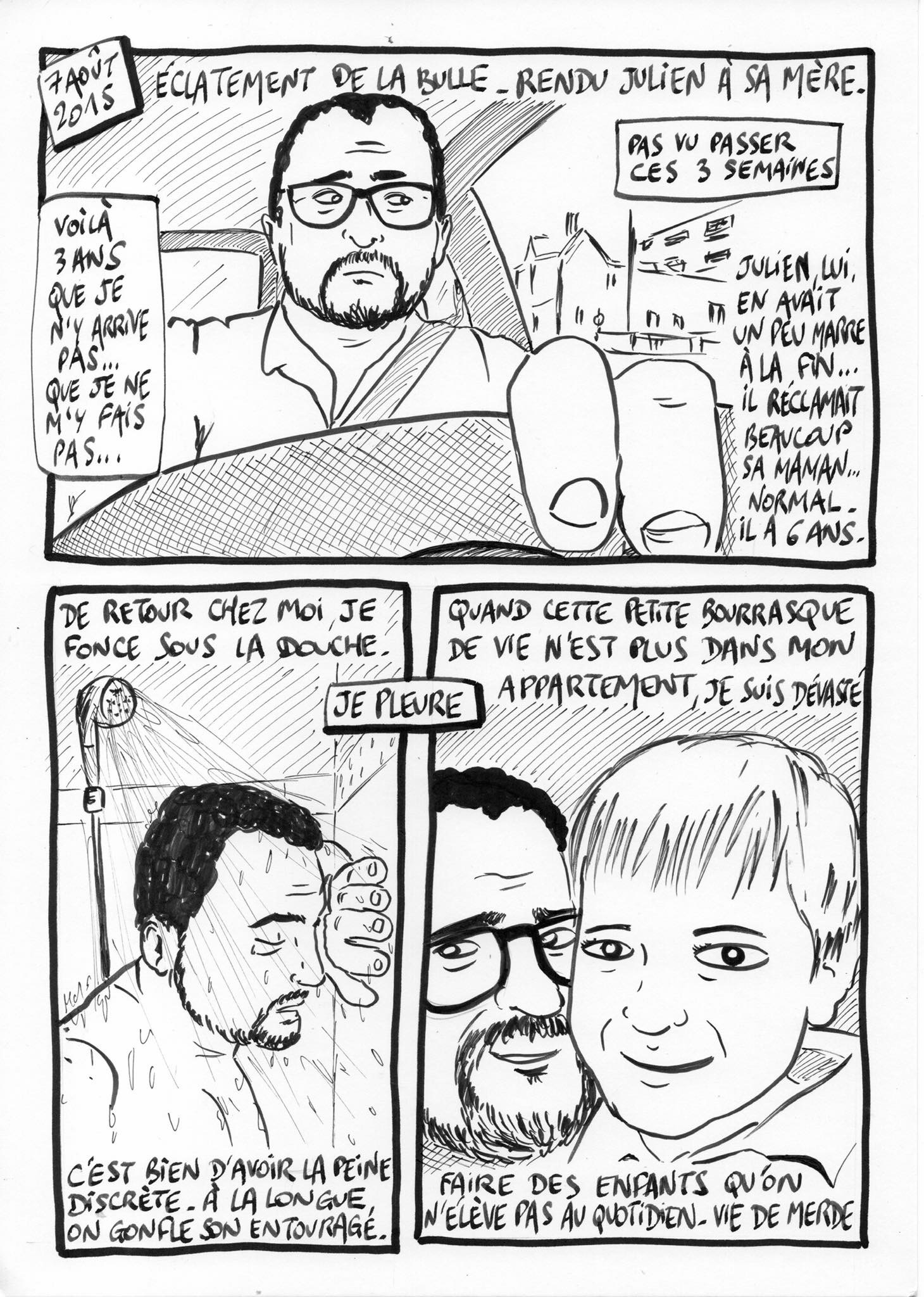 Ma foi, jusqu’à la création d’Egoscopic, le dit parcours fut assez modeste. Plus jeune, j’ai créé quelques fanzines, participé à quelques autres… Je me suis lancé dans ma Bd autobiographique « Gorgeous comix » (3 tomes à ce jour). Puis en 2012, j’ai eu l’idée de créer un collectif BD autobiographique qui réunirait à la fois des dessinateurs reconnus et d’autres en devenir. Une démarche basée sur la solidarité entre auteurs, très « de gauche ». Tout moi, quoi…