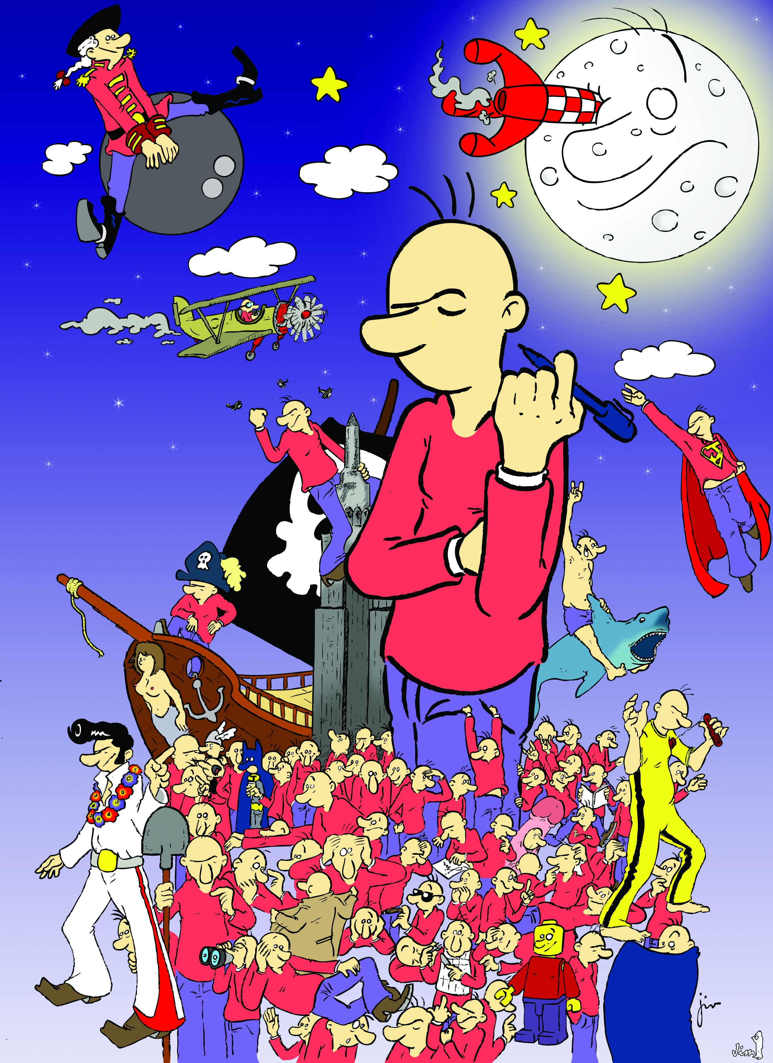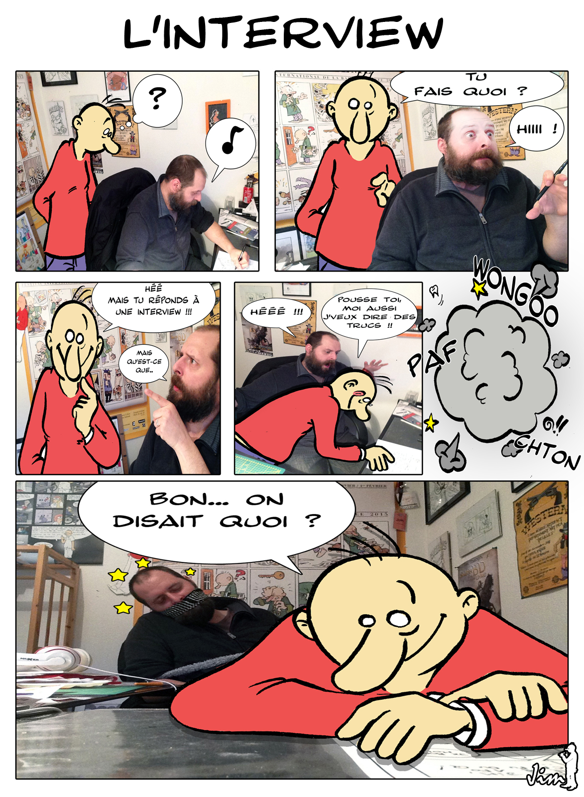 Je me suis longtemps appelé Jim dans mes dessins, jusqu’au jour où j’ai eu contact avec l’autre Jim (un chouillat plus connu que moi … theutheu), ce dernier était un peu ennuyé parce que les différents salons que je fais ont la fâcheuse tendance à me référencer sous sa carrière à lui.