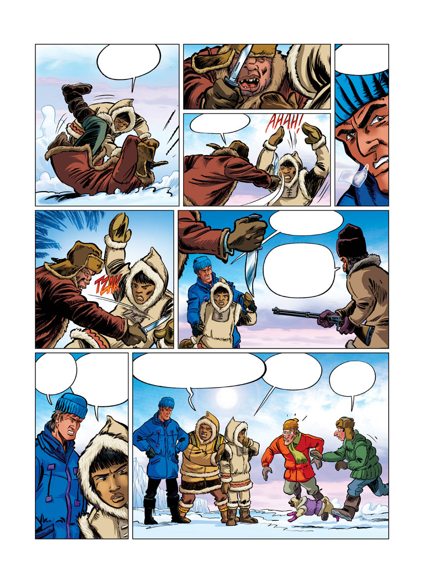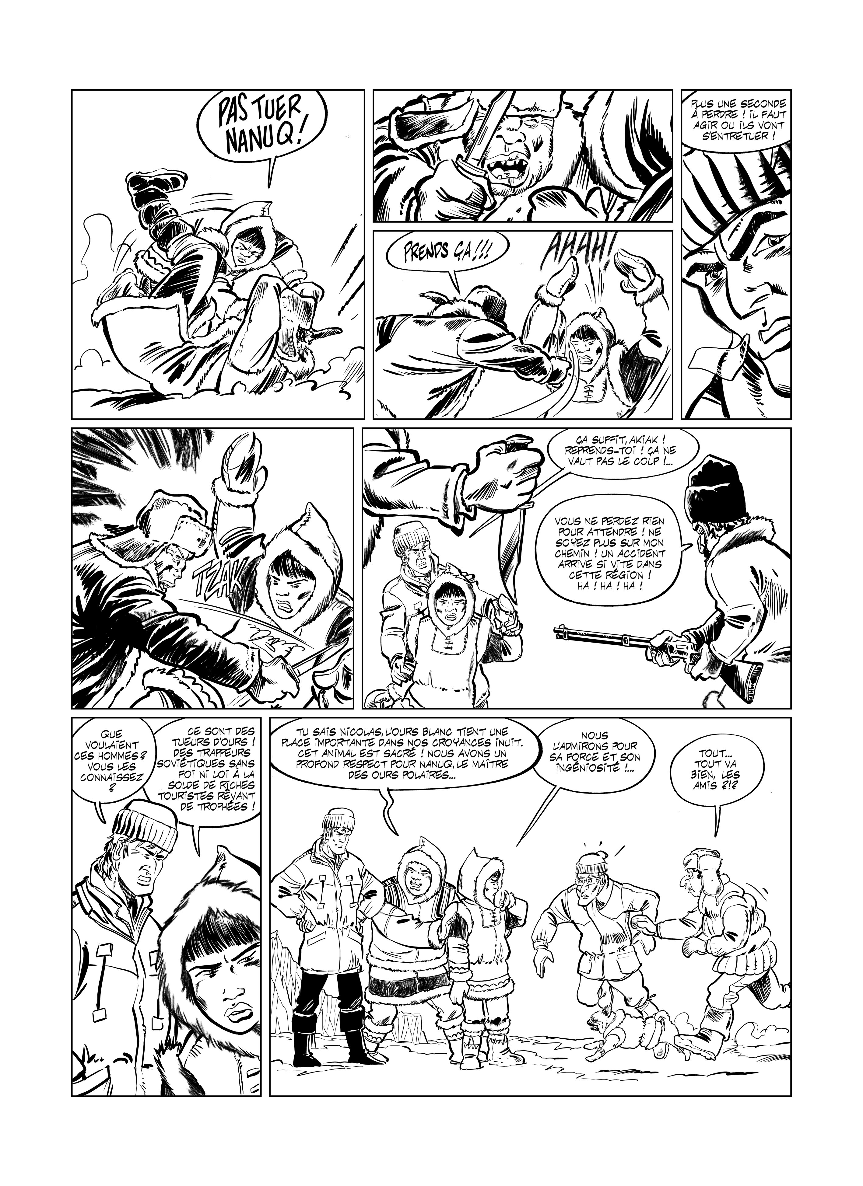 Ushuaïa BD (Les aventures de Nicolas Hulot)... J'ai la chance de connaître Nicolas Hulot depuis longtemps. Ayant illustré pour lui, au fil du temps, nous sommes devenus des amis. C'est moi, qui ai eu l'idée d'adapter en BD l'équipe d'Ushuaïa. C'est une nouvelle série et chaque année il y aura un album de prévu. Au départ de cette aventure, j'allais 2/3 fois par mois pour lui montrer l'avancement. Il m'a guidé et surtout laissé carte blanche. J'insiste sur le fait, qu'il ne prend aucun centime, ni droits... Et pour ceux qui pensent qu'il est propriétaire des déodorants ou autres produits, il n'a rien à voir avec tout ça, car c'est TF1 qui est propriétaire de la marque Ushuaïa et non Nicolas. Dans notre BD, ce sera l'aventure avec grand A. Un mélange de Ric Hochet, Gilles Jourdan, Tintin... Que des bons ingrédients. Le dessin est assuré par mon ami Curd Ridel, qui se débrouille vachement bien. Il fait un travail superbe et lui aussi est très professionnel, très régulier, on peut lui faire confiance sur la qualité. Son public, risque d'être agréablement étonné, car il a un peu changé son style graphique pour bien coller à l'ambiance et au trait voulu. La couleur est réalisée par Pierre Schelle, coloriste de talent, régulier également et très professionnel. Il connaît bien son boulot.
