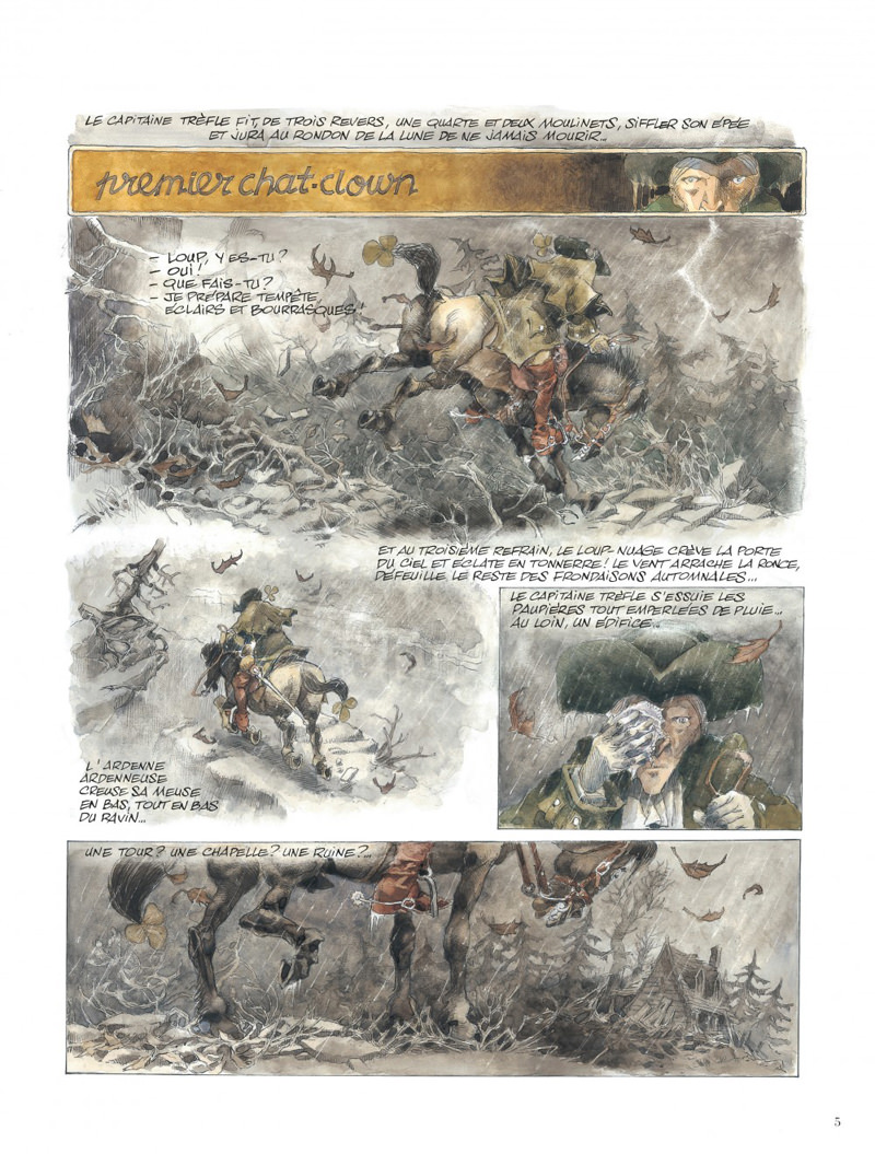 Ça a quand même eu une influence sur la suite. J'ai toujours gardé en tête ce que j'avais dessiné à l'époque. C'est un peu différent. Dans l'esprit de Pierre, il y a un petit coté sur-réalisant dans son texte. Je ne me suis pas trop attardé à ça. Il m'a dit : "Tu fais ce que tu veux, tu as la bride sur le cou, tu interprètes ça comme tu veux.". Mais dans son esprit, au départ, le Capitaine Trèfle était comme il dit "un petit marquis", un frêle petit marquis, extraordinaire escrimeur, rapide, mais pommadé, avec des perruques à marteau. J’en ai fait plutôt un personnage qui, s’il était porté au cinéma, pourrait être interprété par Vincent Cassel.