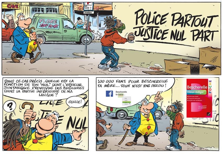 Fabcaro livre un scénario "storyboadé", donc esquissé. Il donne ainsi une idée des cadrages qu'il voit pour la page. J'ai le choix de garder ses cadrages ou non. En définitive, je choisis les cadrages qui me semblent les plus efficaces pour le gag. Et quelque fois je choisis mes cadrages, quelque fois je garde ceux de Fabcaro. Un peu de mélange des deux visions parsème donc les pages de l'album. Pour les couleurs, c'est Mel qui s'en occupe.