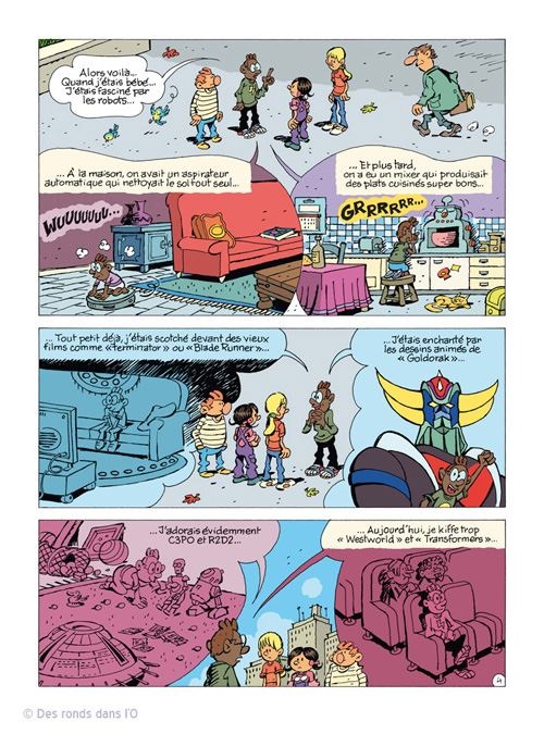 Si Des ronds dans l’O s’est lancé dans ce pari, c’est peut-être parce que déjà Corbeyran joue dans un terrain qui n’est pas de prédilection pour lui. Après Le cadet des Soupetard à ses débuts, c’est sa seule série vraiment jeunesse. Dans Zélie & Compagnie, Corbeyran la joue Club des Cinq. Zélie Bistouri mène la troupe composée de Noël, dit Boycott, le rigolo de la bande, Albert, dit Einstein, le scientifique, Agathe, dite Coin-Coin, la voie de la sagesse, ainsi que Benoît, dit Laglu, le petit frère d’Agathe qui ne perd pas une occasion pour s’incruster dans le groupe. Les cinq histoires de ce nouvel album tournent toutes autour de la robotique et de l’éthique qui y est liée. La politique prend au passage un petit, non un gros, tacle non dissimulé grâce à ou à cause de Monsieur le Maire.