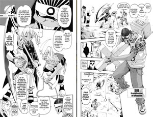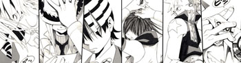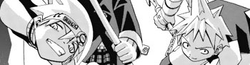 En premier lieu, les 3 premiers tomes (à part le dernier chapitre) correspondent donc aux 11 premiers épisodes de la série animée. Quand on a le manga papier en main et après avoir vu un peu de l’animé, on se rend compte que nous avons là un graphisme particulier et exceptionnel qui change de tout ce qu’on a pu voir jusqu’à maintenant. Le dessin d’Atsushi Ohkubo est terrible, son trait est nickel et surtout très dynamique, ils sont rares les mangas à avoir des dessins qui semblent s’animer tout seul ! C’est ça la puissance de Soul Eater, c’est un manga qui a la pêche, ça ne s’arrête jamais. Comme j’ai dis avant les décors sont « timburtoninens », fabuleux, originaux surtout la lune et le soleil qui me font marrer à chaque fois que je les vois. Les personnages ont des looks d’enfer comme le Shinigami (et ses deux facettes) et Kid, son fils, Stein ou encore Medusa. Tout est bien recherché, chaque chose à son petit détail bien particulier qui fait qu’on a les yeux qui regardent dans tous les coins pour ne pas rater quoique ce soit ! C’est ce que j’aime dans les bd, les comics ou les mangas, c’est de ne pas me lasser de voir tout le temps les mêmes décors, les mêmes personnages… non dans Soul Eater il y a de la vie et une grande part d’imagination débordante, il m’est d’avis qu’Atsushi Ohkubo doit être un auteur fabuleux !