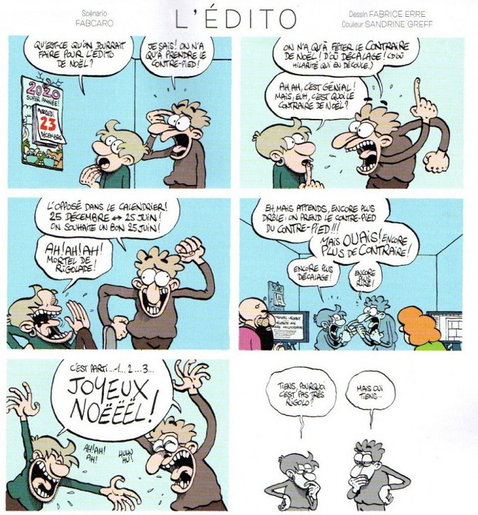 C’est peut-être le numéro le plus attendu de l’année. Si le Spécial grandes vacances respire bon le sable chaud, les barbec’ entre amis et l’eau de mer, le Spécial Noël a ceci en plus qu’il a un éternel goût d’enfance. Cette année, c’est Bruno Dequier qui a l’honneur de dessiner la magnifique double couverture traditionnelle, marquant le retour de Louca après une longue absence. Petite curiosité : alors que le tome 8 de Louca vient de sortir, c’est le tome 7 qui est post-publié, alors qu’il n’avait pas été pré-publié avant son édition en album. Reste à espérer que les deux histoires s’enchaîneront donc dans le magazine. Autre retour, celui de Champignac dans sa série rien qu’à lui.