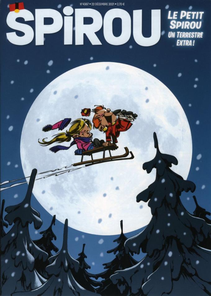 Avant dernier numéro de l’année et certainement la plus belle couverture de 2022 ! A la manière d’Elliott transportant E.T. sur son vélo, le Petit Spirou et Suzette passe devant la pleine lune… en luge. Des flocons de neige recouvrent la cime des sapins. C’est merveilleux. Pour l’occasion, Janry signe deux gags de ce « fils » qu’il a eu avec Tome et qui nous manque tant.