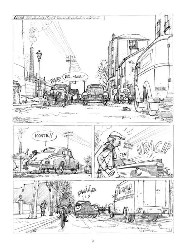 Depuis quatre épisodes, les aventures de Jacques Gipar bénéficient d’une belle édition des crayonnés sublimant le graphisme de Delvaux. Il n’y a pas à dire. Au crayon, les bagnoles (parce que ce ne sont pas des voitures mais des bagnoles dans le sens noble du terme) ont une vivacité impressionnante, malheureusement et inévitablement aplatie par l’encrage et la mise en couleurs, malgré tout le soin qui est apporté à ces deux étapes.