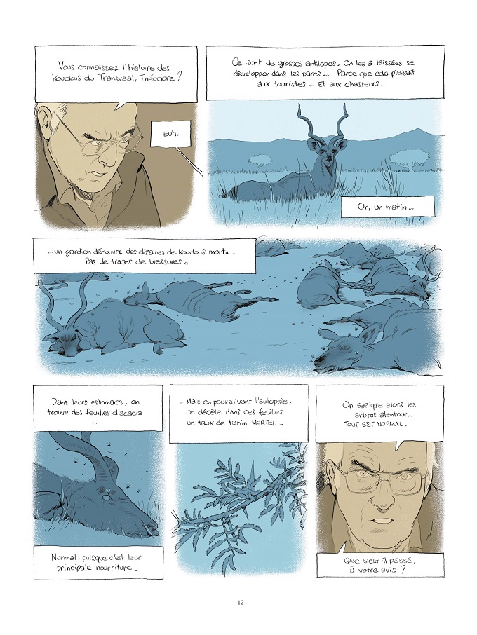 Avez-vous déjà entendu parler de ce fait divers qui s’est produit il y a quelques années en Afrique du Sud ? Afin de réguler la population des koudous (antilopes), les acacias ont produit des feuilles toxiques empoissonnant mortellement une grande partie de l’espèce. Les arbres communicants entre eux (démontré scientifiquement) se sont mis à sécrétés une toxine nocive combattant la faune se nourrissant de leurs feuilles. Sur base de cette découverte, Zep nous propose un scénario semblable mais cette fois appliqué à l’espèce humaine ! Que se passerait-il si un jour les arbres au lieu de filtrer l’air rejetteraient des composants mortels pour l’homme ? Reviendrait-on à une situation identique à celle vécue lors de la disparition des dinosaures ?