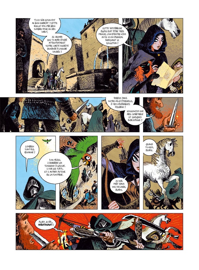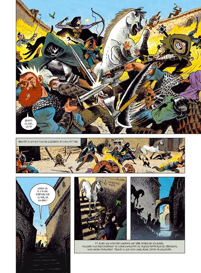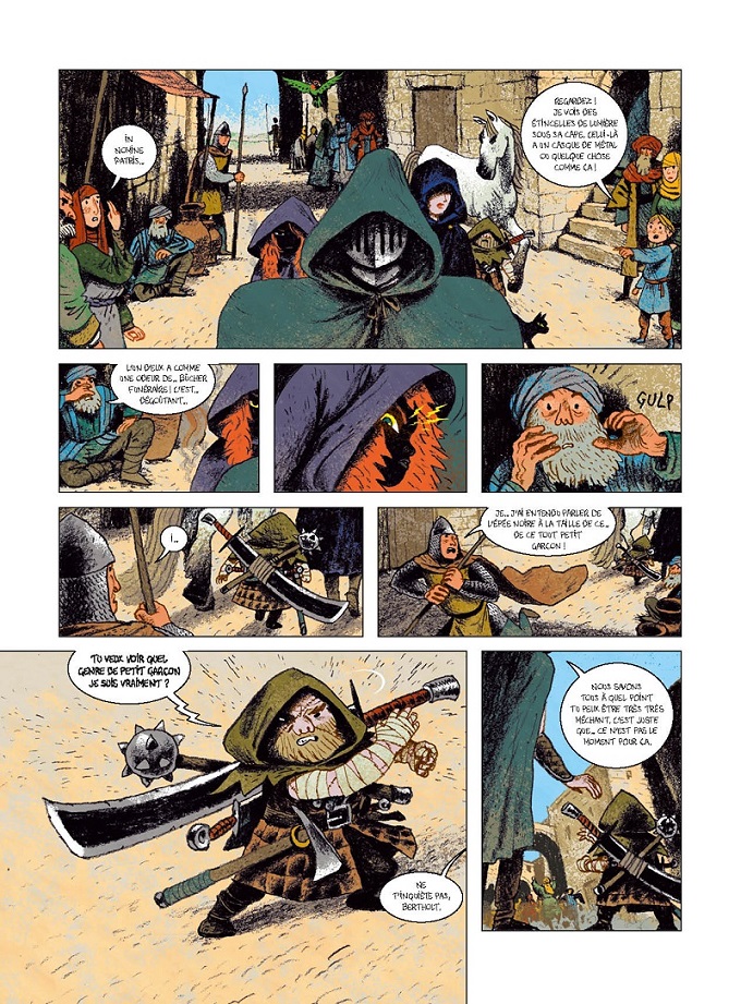 Récit hors du temps et hors cadre classique, ce conte a de quoi nous surprendre de bout en bout. Epopée à la fois poétique et moyenâgeuse, où humour, dérision, second degré et clins d’œil ne manquent pas, dans un graphisme unique, mélange d’un trait à la fois emprunt de naïveté à la grosse gouache et d’un rythme désarticulé, scénariste et dessinateur forment un couple improbable mais au résultat explosif !