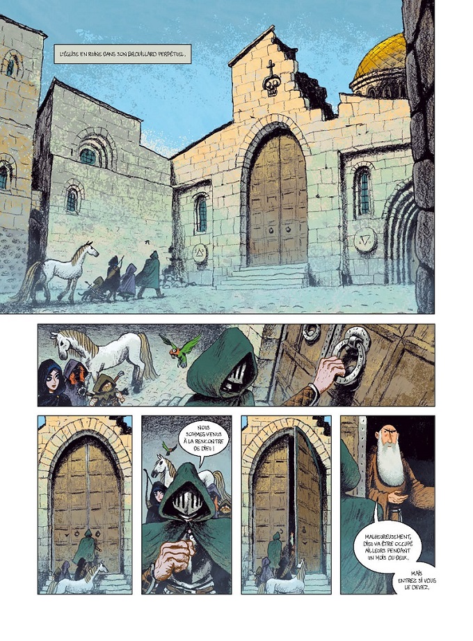 Nous sommes en 1271 et 7 pèlerins arrivent à Jérusalem à la recherche d’un « mystérieux et douteux monastère de l’urgence de Dieu du Pardon miséricordieux et tout-puissant » dans la ruelle sans issue du Golgotha. La petite bande est assez atypique puisque constituée notamment d’un chat, d’un oiseau et d’un cheval ! Une odeur de brûlé se dégage à leur passage … Ils espèrent y retrouver leur intégrité physique car … ils sont morts ! Fantômes de leur propre existence, ce ne sont plus que des ex-gens, des ex-people !