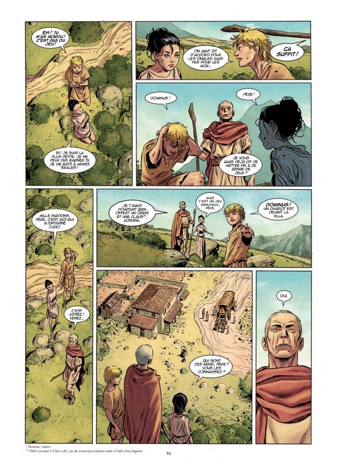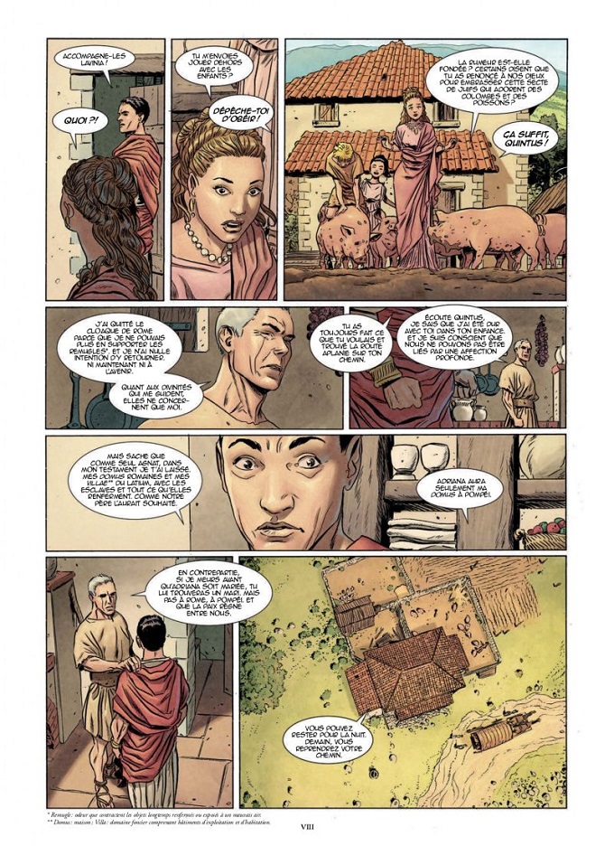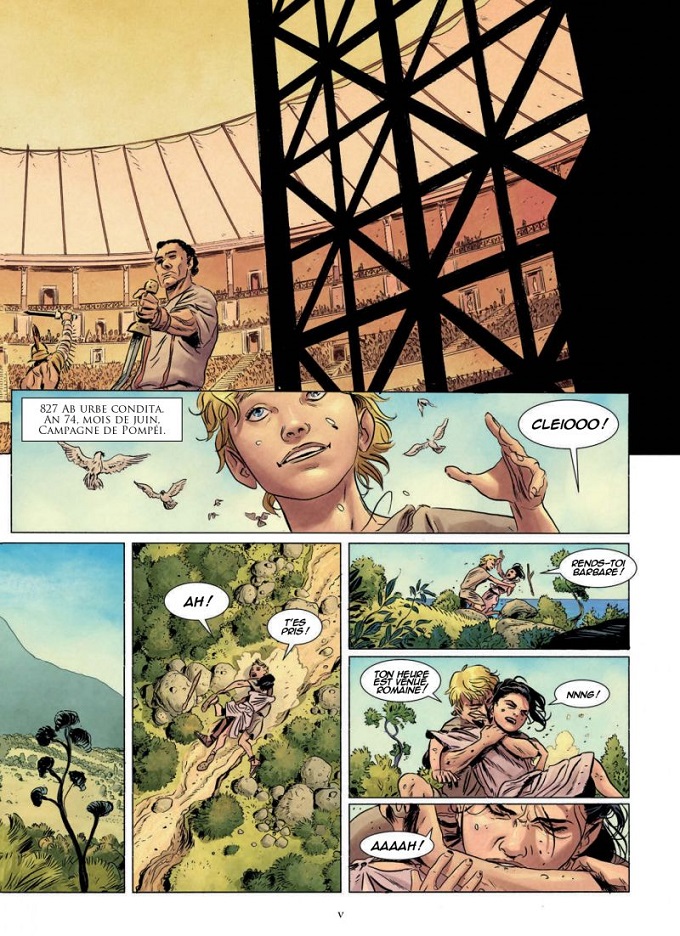 Les dialogues sont plus que crédibles et l’insertion de nombreux termes latins augmente l’intérêt historique de l’ensemble. La mise en scène, le découpage des planches, les angles de vue, le rythme de l’action, tout y est pour planter le lecteur dans un spectacle épique de grande qualité ! Un graphisme plus que réaliste, des couleurs chaudes et violentes à la fois, un souci du détail notamment dans les décors et paysages offrent à la narration cet aspect « historique » indispensable. Le tout finissant sur une scène finale prometteuse d’un deuxième tome « rageur » !