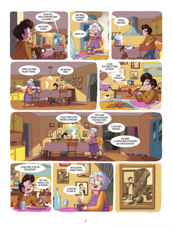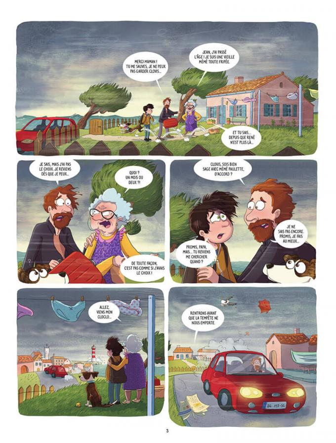 Carbone, scénariste confirmée, met en forme l’histoire imaginée par Marie Tourat et Pauline Roland. Les autrices signent une comédie déjantée et totalement foutraque. Clovis est un ado d’aujourd’hui, qui s’élève tout seul parce que les parents n’ont pas le temps ou ont leurs problèmes. Du temps de Mamie, ce n’était pas comme ça. Mémé Paulette est la grand-mère qu’on aurait tous aimé avoir, dynamique, jamais fatiguée, politiquement incorrecte, tout ça pour dire qu’elle dit ce qu’elle pense et qu’elle fait ce qu’elle veut. Bonnie, c’est Milou, mais en plus drôle. Et on n’a pas parlé de Macarel, un vieux goéland à la jambe de bois qui a du vécu.