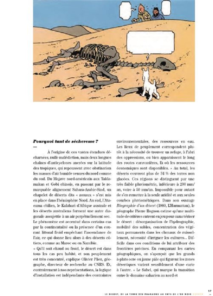 Vous avez trouvé ? Le désert évidemment ! Dans chacune de ces aventures, Tintin y est confronté. Et pas toujours pour le meilleur ! Loin d’être un endroit uniquement aride et uniforme, monotone, il est mouvant, rempli de dangers mais également de vie et de rencontres surprenantes. Entre le « tout » et le « rien », le désert est un terrain de jeu incroyable pour un aventurier comme notre reporter du Petit XXe.