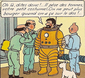 Tout aussi actuelle, la forme des combinaisons spatiales imaginées pour Tintin et ses amis n’est pas éloignée de celles qui sont toujours employées aujourd’hui, malgré leur teinte orange et leurs casques trop transparents pour éviter les brûlures des rayons ultra-violets… De même, si elle a longtemps été considérée comme improbable, la présence de glace sur la Lune a été officiellement confirmée par la NASA en août 2018.