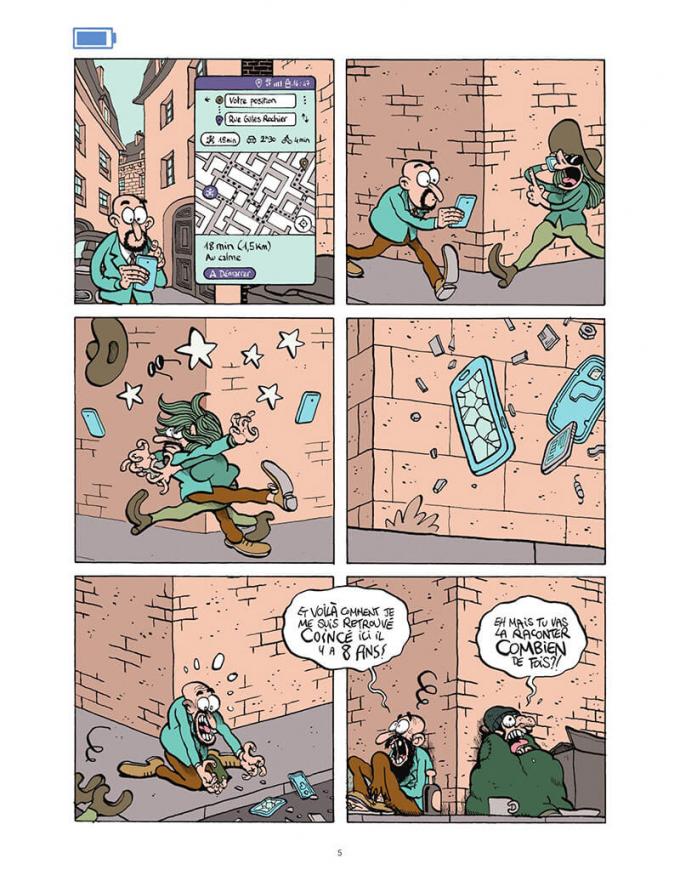 Se perdre en ville des années durant si le portable se casse et qu’on ne peut plus utiliser l’application Plan, oui, c’est possible. Provoquer une panique générale en partant acheter du pain, pour ne pas dire une chienlit, oui, c’est possible. Pourrir sa réputation numérique à cause d’un simple rendez-vous chez le médecin, oui, c’est aussi possible. Toutes ces aventures, ces avanies, sont racontées par Fabrice Erre dans cet album si tristement drôle ou si drôlement triste. Du culte de soi avec le type qui se filme H24 en faisant ses courses ou en faisant l’amour aux applis qui nous apprennent à courir, éviter les épidémies et pourquoi pas bientôt à respirer, l’auteur fait de l’humour tout simplement en observant les comportements de ses concitoyens.