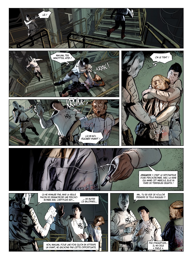 Jerry Frissen créé tout un monde interplanétaires. Simak pourrait être une variation de Valérian. Il y a de l’action, de la séduction, de l’humour (« Tu ferais mieux de fermer tes gueules. »), mais la forme, encore plus que le fond, reste plus sombre. Le scénariste présente le concept du Simak. C’est une créature illégale, un transhumain, un homme modifié par la paraguilde pour les bordels de luxe de la planète, et dont les capacités de métamorphose ont échappé à leurs créateurs. Et là où Frissen tire son épingle du jeu, c’est qu’il ne cède jamais à la facilité. La planète du plaisir aurait pu présenter des scènes d’orgies ou de luxure. Jamais. L’histoire reste sobre et intelligente. Les thèmes abordés sont d’actualité, des paradis artificiels, avec le Pikul qui permet de s’évader dans des rêves doucereux, à la lutte contre le sectarisme. La religion et la justice sont aussi au cœur de la problématique avec notamment cette scène où les fliks veulent prendre d’assaut un temple au moment de la prière.