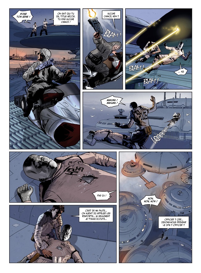 Dans les années 80, les éditions Glénat nous faisaient découvrir le style hyper réaliste de Don Lawrence avec Storm et L’empire de Trigan. Dans sa digne descendance et dans un style photographique, Jean-Michel Ponzio est en train de marquer les années 2010. Une enveloppe qui pourrait être froide et figée est transformée en gangue émouvante et dynamique, tout en préservant les codes purs de la BD.