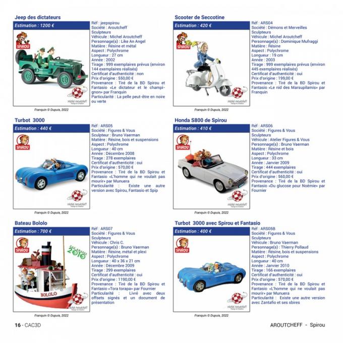 Arrêtons-nous au hasard, ou presque, sur quelques uns d’entre eux. Qui n’aurait pas envie d’être assis entre Gaston et Mademoiselle Jeanne dans la Fiat jaune produite en 1999 par Michel Aroutcheff ? Pour cela, il vous faudra débourser 920 € pour obtenir l’un des 358 exemplaires réalisés sur les 999 prévus à la base. Si une image de Gaston est mythique, c’est bien celle où le gaffeur est endormi dans une grotte de courrier en retard. L’image a été imprimée sur une plaque sérigraphiée en 2013 par Coustoon. 100 exemplaires. Prix d’origine 625 €. Estimation 720 €. Passons à Spirou en se basant sur le Co du titre Franquin & Co, avec cette figurine en résine du Snouffelaire, personnage emblématique de L’horloger de la comète, album de Tome et Janry. Editée par Fariboles, ses neuf centimètres de haut sont à vous pour 310 €. Franquin se taille évidemment la part du lion. Voyez la magnifique Bulle polychrome de « Figures & vous » disponible en couleurs ou en noir et blanc avec une scène de Spirou et Fantasio tirée de Z comme Zorglub. Admirez le petit Noël et l’Elaoin en résine et métal chez Idem. Laissez-vous séduire par la belle Marsupilamie coquette chez Leblon Delienne. Faites du golf avec l’Evêque sur la signature de Franquin en métal chez Pixi & Cie.
