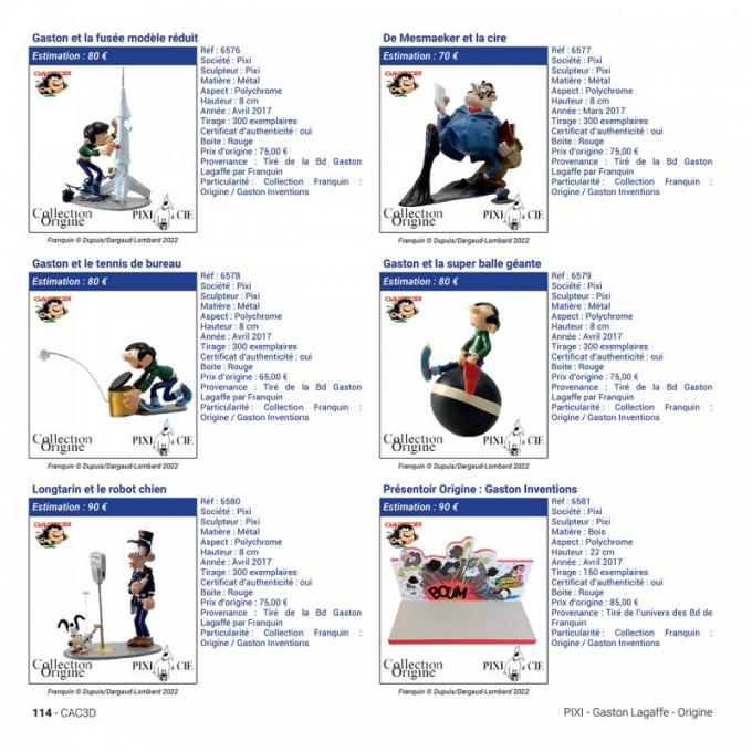 Pour chacune des figurines, il y a évidemment l’estimation de la côte et une photo de l’objet, avec le nom du fabricant, accompagnée de sa licence et de son copyright. A côté, on trouve les informations détaillées : référence, société, sculpteurs, matière, aspect, dimensions, année de production, tirage, certificat d’authenticité, prix d’origine, provenance et, éventuellement, particularité et contenant. Plus de 650 objets de 27 fabricants sont ainsi référencés.