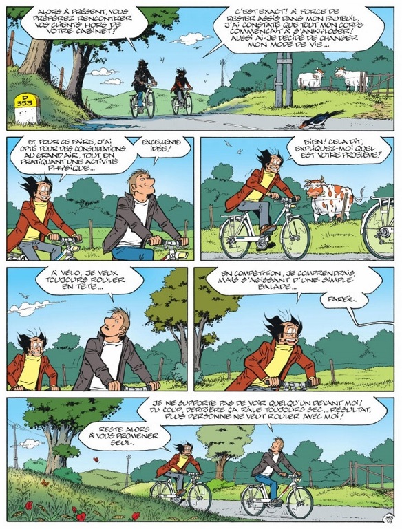 Le Docteur Médard a le moral dans les chaussettes. Le fondu du Tour de France court toujours après les vélos; la fillette possédée a toujours le démon en elle; la toquée du ménage aspire de plus belle; le passe-muraille tente toujours vainement de traverser les murs; l’agent fiscal est toujours obsédé par le redressement fiscal. Ce ne sont que des exemples parmi d’autres. Ces échecs ont conduit le psy le plus célèbre du neuvième art à ranger son divan et à se lancer dans l’élevage de chèvres. Mais un bon psy fait-il un bon berger ?