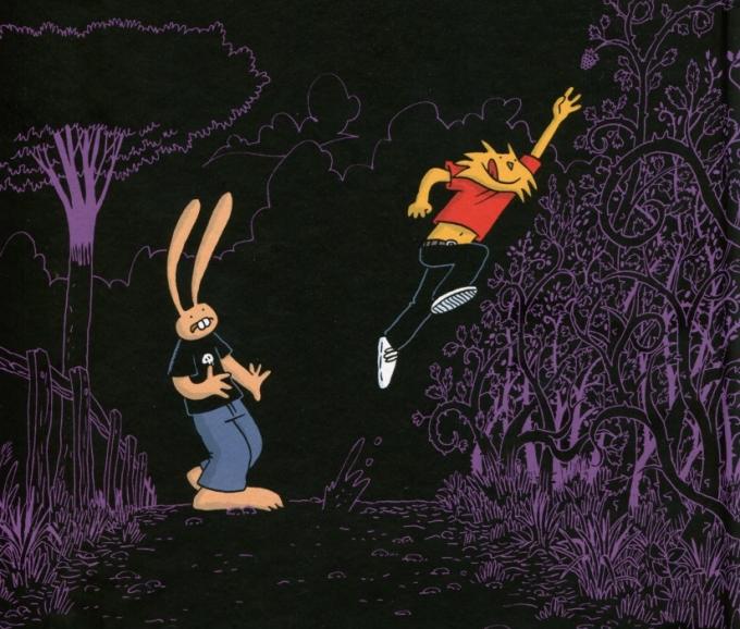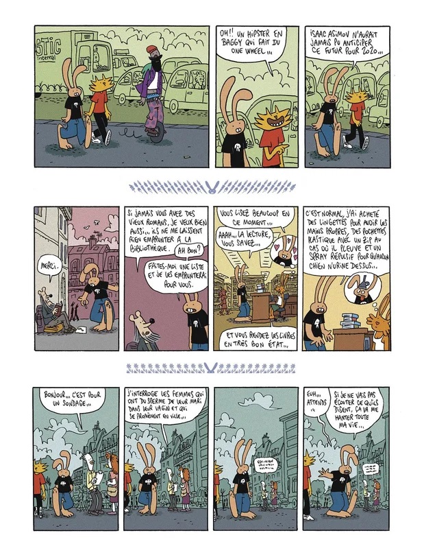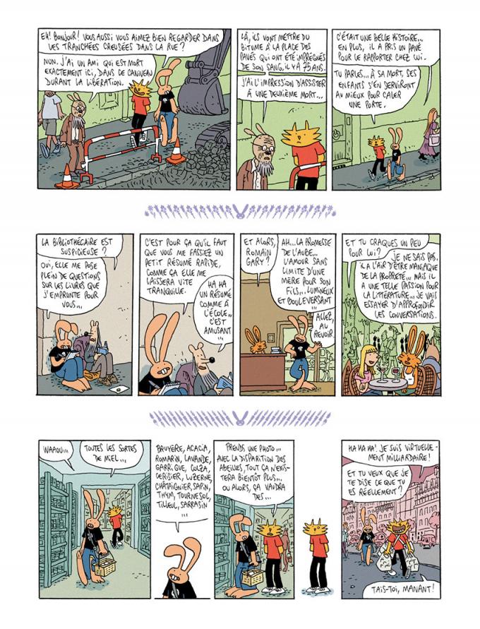Découpé sous forme de strips à chute, le récit adopte une forme de narration qu’il n’a pas dû être aisé à gérer pour son auteur. Trondheim, dans un défi Oubapesque (Ouvroir de bande dessinée potentielle), reste fluide et cohérent. Les strips alternent en faisant avancer le récit. Lapinot, en acteur candide, subit plus qu’il n’agit. Des amis, des amours, des emmerdes, un vaste programme l’attend. Richard, dont le rôle est ici prépondérant, apporte une dimension drôlissime. Les dialogues sont au cordeau. Lewis adopte la méthode Francis Weber, pesant chaque mot pour aboutir au texte parfait et percutant. Il n’en oublie pas moins les interludes poétiques, dans des strips souvent muets, qui sous prétexte de ne rien dire en disent long.