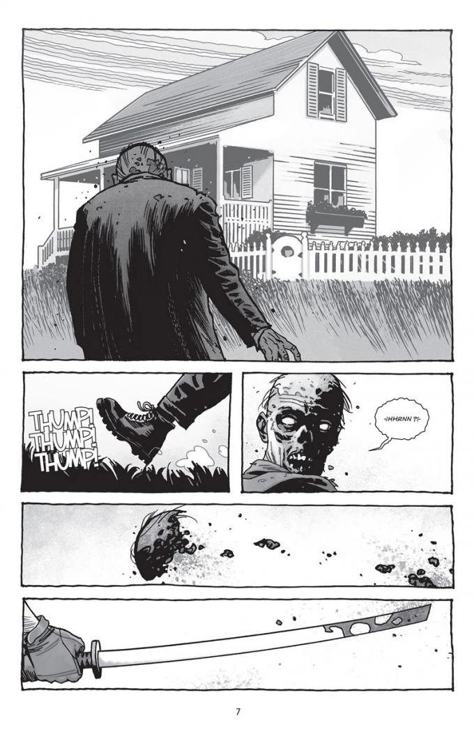 Ce trente-troisième opus est en fait un demi-comics complété par un conclusion de Robert Kirkman, un mot de Charlie Adlard, les cinq planches du projet d’origine présenté à l’éditeur en novembre 2002, puis un entretien avec Kirkman et Eric Stephenson, rédacteur en chef d’Image Comics. On retiendra surtout de tout cela le post-scriptum de la postface du scénariste : Negan a survécu. Cela laisse penser que si le dessinateur en a fini avec l’univers Walking Dead, Robert Kirkman a des idées derrière la tête.