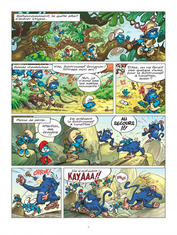 Un nouveau dessinateur entre aux studios Peyo pour signer le dessin de ce quatrième épisode. Et c’est une surprise ! Ce n’est pas n’importe qui, c’est Laurent Cagniat, connu pour avoir signé la série Vauriens dans les années 90 chez Delcourt. Les spécialistes reconnaîtront sa patte dans l’attitude de certains personnages. Avec tout le respect que l’on doit au travail de dessinateurs comme Alain Maury, le regretté Pascal Garay, Jeroen de Coninck, Miguel Diaz Vizoso ou encore Ludo Borecki, c’est la première fois que l’on voit un dessinateur oser garder sa propre personnalité. Alors que tous les dessinateurs cités sont ou ont été les meilleurs gardiens du temple, Laurent Cagniat laisse passer des bribes de son ADN. On n’avait pas vu cela chez les Schtroumpfs depuis Marc Wasterlain dont on repère les traits dans La soupe aux Schtroumpfs.