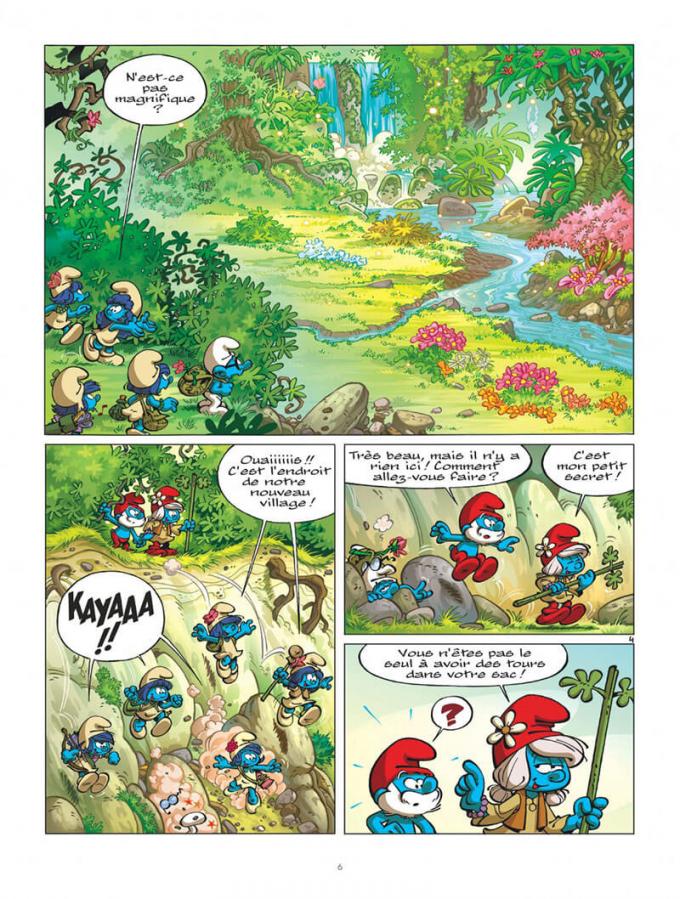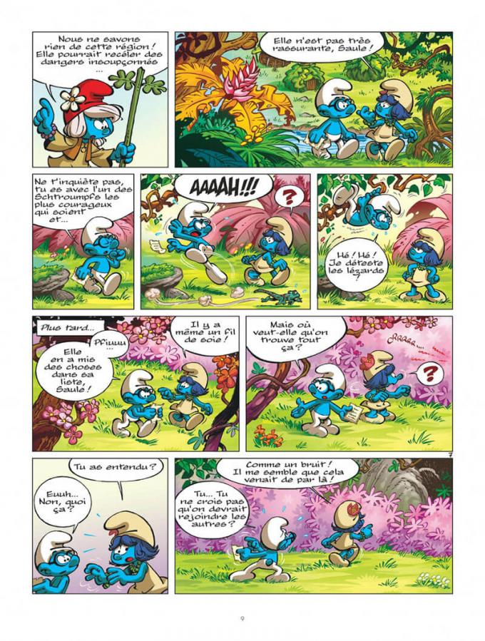 Luc Parthoens et Thierry Culliford rebondissent sur la destruction du village des filles dans le tome précédent. Aidées des Schtroumpfs mâles, elles sont contraintes de s’exiler pour trouver des cieux plus cléments. Il n’est jamais évident dans un univers créé de toutes pièces de le renouveler. De la contrainte, née l’innovation. Dans cet épisode transitoire, les filles ne sont plus chez elles mais pas encore dans leur nouvel eden, si eden elles trouvent. Les lecteurs fidèles d’Harry Potter liront l’histoire comme un clin d’œil à Aragog. On laisse les aficionados comprendre l’allusion pour que le mystère reste complet.