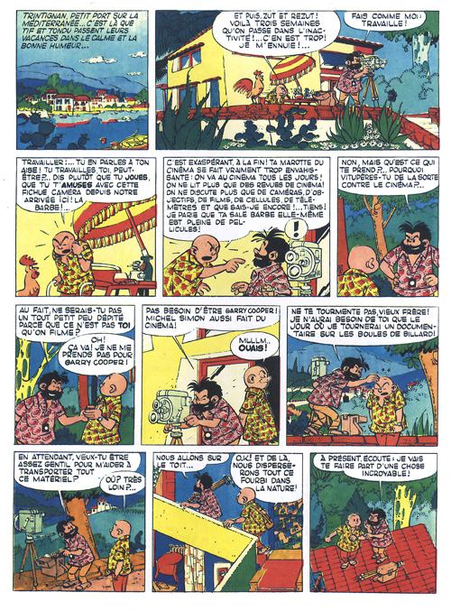 - Travailler !... Tu en parles à ton aise ! Tu travailles, toi, peut-être ?... Dis plutôt que tu joues, que tu t’amuses avec cette fichue caméra depuis notre arrivée ici ! La barbe !... C’est exaspérant à la fin ! Ta marotte du cinéma se fait vraiment trop envahissante : on va au cinéma tous les jours ! On ne lit plus que des revues de cinéma ! On ne discute plus que de caméras, d’objectifs, de films, de cellules, de télémètres et que sais-je encore !... Tiens ! Je parie que ta sale barbe elle-même est pleine de pellicules ! »