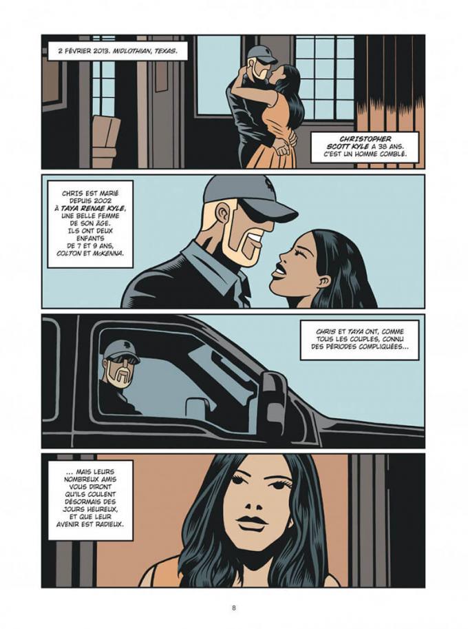 Fabien Nury raconte un morceau important de l’histoire de l’Amérique. Dans un pays incroyablement patriotique, le scénariste décortique les derniers mois de Chris Kyle de manière journalistique et méticuleuse. De la manière la plus objective possible, mais bien évidemment influencée par les propos véridiques des personnages, Nury permet de comprendre d’une part l’aura que dégageait un type comme ce tireur d’élite, mais aussi les cicatrices et les meurtrissures pas forcément apparentes que laissent les conflits armés. Eddie Ray Routh n’est pas un cas isolé. Comme des milliers de soldats dans le monde, il est tombé dans la drogue, l’alcool et la dépression. Il est le caillou dans la ranger d’une nation pré-trumpienne. Il y a beaucoup plus de politique qu’on ne pourrait le penser dans cet album.