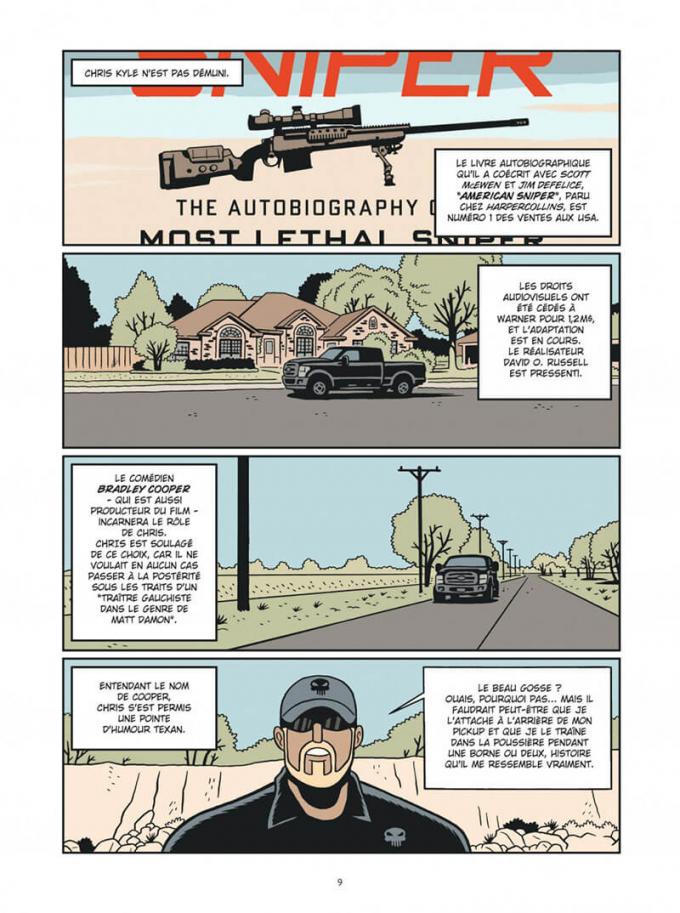 Le graphisme spécifique de Brüno sert au mieux cette histoire aux frontières du reportage. Son trait épais donne une invincibilité apparente à Kyle. Il en fait un colosse aux pieds d’argile, se sentant intouchable en tant qu’icone d’une nation. Les instants suspendus des scènes tragiques leur donnent une certaine dimension. Là où Brüno est un brin moins convaincant c’est quand il essaye de trop coller aux personnages réels comme la mère d’Eddie ou le journaliste O’Reilly, les rendant trop caricaturaux.