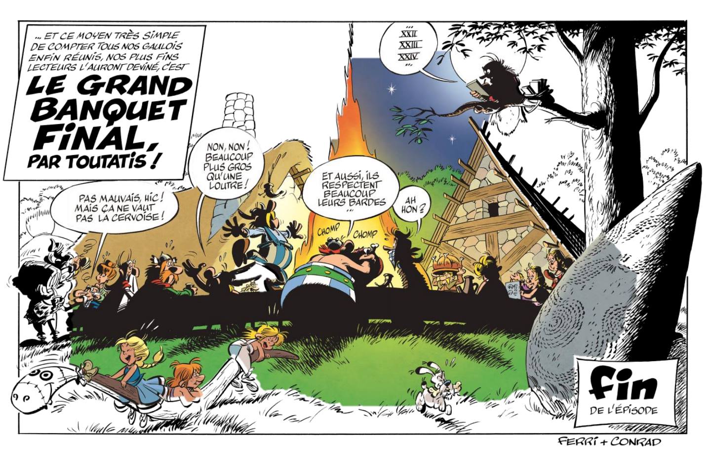 Ci-dessous, découvrez une image qui circule sur le net et les réseau sociaux. On y découvre la case de fin des nouvelles aventures d'Astérix partiellement colorisée. Nous pouvons avoir un petit aperçu du travail graphique de Conrad qui visiblement s'en est très bien sortit (voir aussi quelques extrait sur la page officielle du site Astérix :http://www.asterix35.com/album.html ) . Il ne reste plus qu'à attendre le 24 octobre pour voir si le scénario sera à la hauteur du dessin.