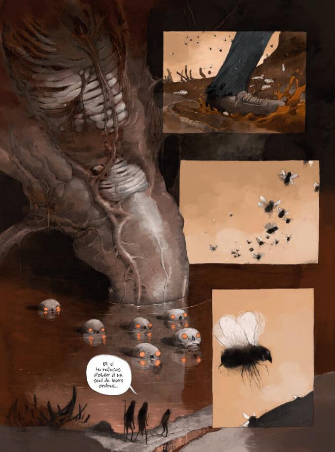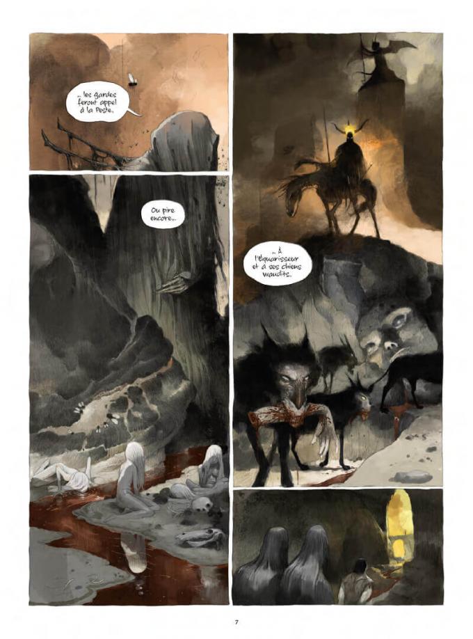Au dessin, Tony Sandoval peint un enfer pavé de mauvaises intentions. Entre démons redoutables et corps décharnés, entre monstres impitoyables et bêtes immondes, Sandoval navigue dans les tons sombres et charbonneux réhaussés par un sanglant rouge-orangé d’une violence brulante. La libération des animaux fantastiques est imposante. Si l’équarisseur est effrayant, attendez-vous à pire avec le démon des origines. Sandoval est le Francisco Goya du Neuvième Art.