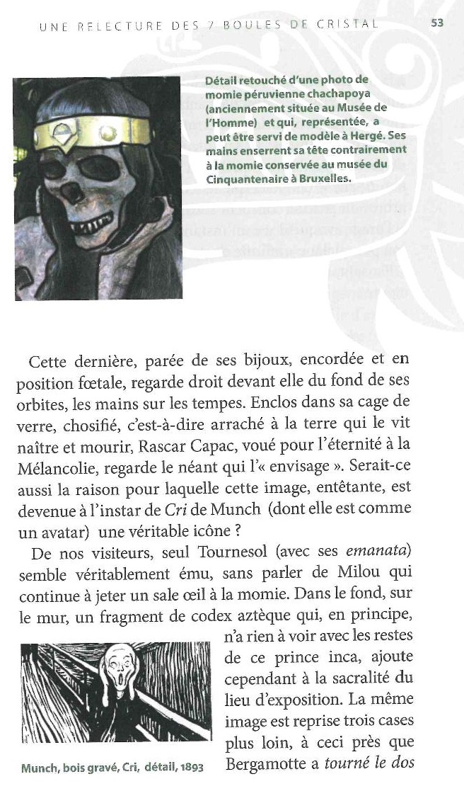 De la prestidigitation à la divination, le premier chapitre digresse autour de la scène mythique du Music Hall. Le chapitre deux traite du malheur qui vient, celui qui frappe les membres de l’expédition Sanders-Hardmuth. Le chapitre 3 est consacré à Rascar Capac, la momie, et à une autre scène mythique de l’album, celle qui en fait la couverture, à savoir la séquence où la boule de feu pénètre dans la pièce dans laquelle se trouvent nos héros. Pierre Fresnault-Deruelle décèle dans la suite un accent théâtral Grand-guignol. On est dans de la littérature policière surfant sur des volutes fantastiques. Le quatrième et dernier chapitre, la course-poursuite, met en comparaison le début et la fin du récit. Détail cocasse, on apprend que Jacques Van Melkebeke et Germaine Kieckens, première épouse d’Hergé, sont croqués page 57.