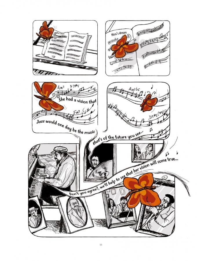 Pour son premier album de BD, Priscilla Horviller fait une entrée remarquée dans le neuvième art. Son dessin est empreint de la musicalité du jazz. Ses cases en noir et blanc mettant en couleur uniquement les personnages principaux qui y figurent sont d’une grand originalité. Horviller maîtrise son personnage principal en le faisant vieillir avec justesse et réalité tout au long de l’album. L’introduction, avec ce papillon qui se pose sur une portée et dont on aura l’écho en toute fin, est très poétique et émouvante.