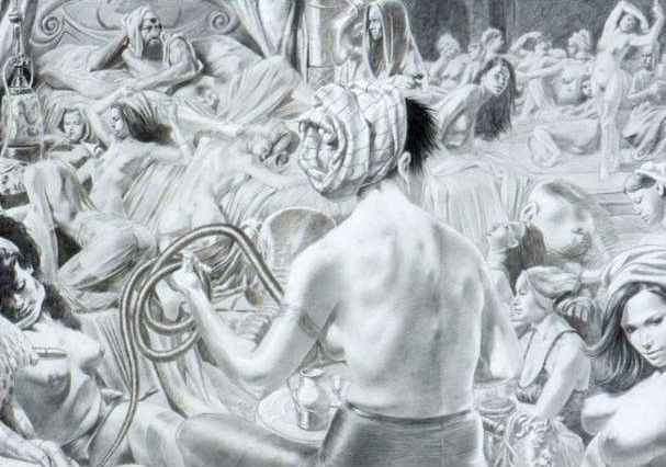 Considéré comme l’un des auteurs les plus marquants de sa génération, le travail de Tanino Liberatore n’a que très rarement été proposé à la vente. Les lots du catalogue représentent le plus bel ensemble de dessins de l’artiste jamais réunis à ce jour. Parmi les pièces remarquables on note cette encre de couleurs pour la planche de fin publiée dans numéro de Mars 1984 d’Hustler estimée à 1 200€. Une série de plusieurs dessins réalisés en 2008 par l’auteur ne manquera pas de retenir l’attention des collectionneurs, comme ce grand dessin à la mine de plomb Au harem entre Ingres et Delacroix estimé à 8 000 €.