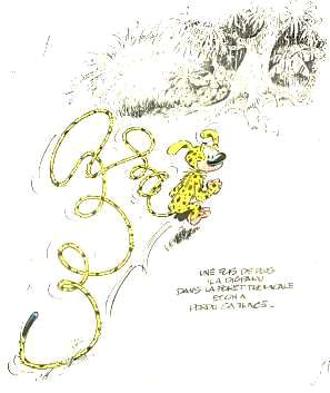 Pour prolonger l’aventure, le catalogue propose une belle encre de Chine et couleurs aux crayons sur calque de Franquin publiée en page 160 de l'album consacré au Marsupilami paru chez Rombaldi à la suite de l'intégrale Spirou en 1987 – Estimations 7 000€ / 8 000€.