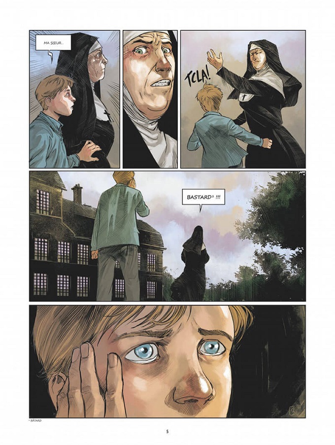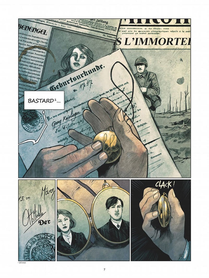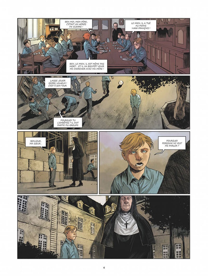 Les scénaristes ( Nathalie Ponsard – Gutknecht & Miceal Beausang – O’Griafa) nous proposent de suivre la destinée de cinq personnes, de nationalités et de générations différentes, qui vont inscrire leurs destins croisés dans des mondes en guerre. Les illustrations confiées à Aurélien Morinière sont vraiment criantes et saisissantes de vérités, ce dernier n’hésitant absolument pas à utiliser des grandes cases voir même des pages entières afin de nous présenter la vie des poilus et les horreurs de la guerre des tranchées. De plus, le choix des couleurs colle est parfaitement judicieux, reflétant les diverses situations dramatiques présentées. Au travers de cette saga familiale, le lecteur traverse divers lieu et époque de la Première Guerre mondiale. À signaler la présence d’un dossier pédagogique relativement bien documenté et structuré en fin d’album.